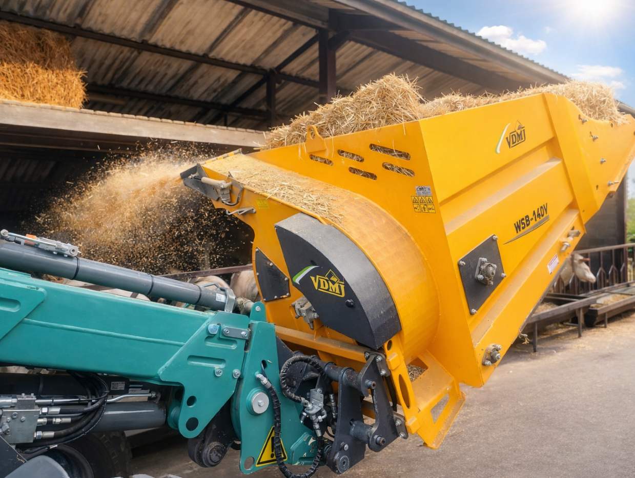 The WSB-140V is a mini straw blower that has been specially developed for small shovels, articulated loaders and skid steer loaders with a dead weight of above 1700 kg and a minimum oil flow rate of 35 l/min. Both square and round bales can be processed with the straw blower. This WSB-140V has a loading length of 1.40m and is standard equipped with a fixed blowing exhaust on the left side. With this exhaust, you can spread close to but also far (10-12m depending on the oil flow). The machine has a rotating floor chain with which you regulate the straw supply to the turbine. The entire operation of the straw blower is done via an electric joystick box in the cabin.